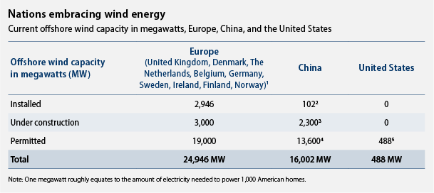 Even if you’re someone who thinks (s)he has followed the followed the failures in U.S. renewable energy policy closely, this brief published by the Center for American Progress will likely impress you, and not in a good way. That’s not to say the piece is bad in terms of the facts it asserts, or the ways in which they’re presented. For a think tank publication, the writing here is about as clear and sprightly as it gets. The facts themselves are what unsettle. The authors, Michael Conathan, CAP’s director of oceans policy, and Richard Caperton, a senior policy analyst, thoroughly catalog a host of wind farms proposed to be built offshore of Maine, New Jersey, Delaware, Rhode Island, North Carolina and even Ohio, which could be served electricity generated by a wind farm in Lake Erie — if our government didn’t keep the rules and regulations for offshore wind in a constant state of flux. Even the one, lone offshore wind farm permitted by the federal government — the long and laboriously battled Cape Wind project off Massachusetts — has recently had the rug pulled out from under it, with the Department of Energy putting a federal loan guarantee for the project on hold. But that’s an inapropos description of what the government has done to seagoing wind power, and the authors do better. The U.S. government doesn’t pull the rug out from under the offshore wind industry; like Lucy does to Charlie Brown, the feds tee up a nice fat football for offshore wind developers to kick — and then pull it away at the last instant, insuring that offshore wind flies high in the air and falls flat and painfully on its back, time and again. The chart showing how far ahead of us China and Europe are in the wind energy field may be the most horrifying element in this well-researched and finely written piece. Congratulations to the authors; would that the mainstream press recapped their work and horrified some voters.