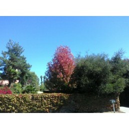 It’s a brilliant, blue-sky, perfect-temperature fall day in Santa Barbara, but fall here isn’t like fall in non-paradisiacal places. Ergo, when you have a photo of a sugar maple turned red next to a 20-foot-tall yucca, both of which frame Hollywood-esque palm trees in the background, you just have to go with it.